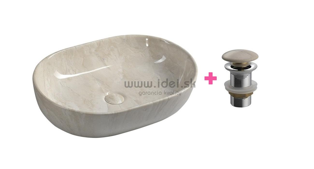 Oválne hlboké keramické umývadlo na dosku s imitáciou mramoru béžové s výpusťou