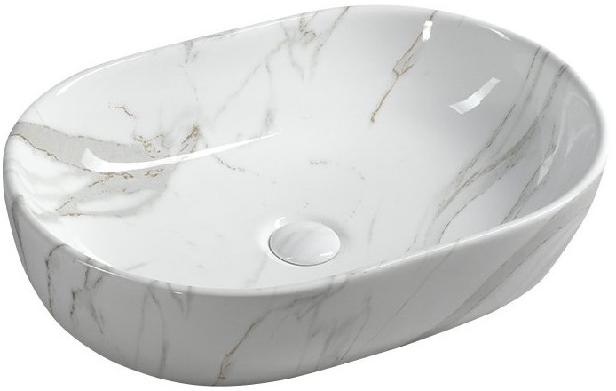 - Oválne keramické umývadlo na dosku s imitáciou mramoru biele s výpusťou