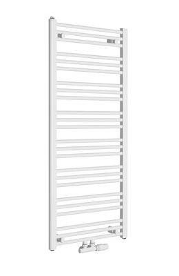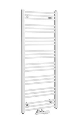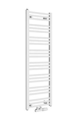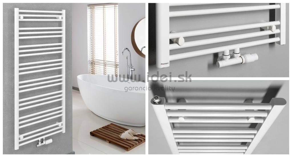 Rebríkový biely kúpeľnový radiátor s možnosťou napojenia ústredného kúrenia aj elektrickej vykurovacej tyče.