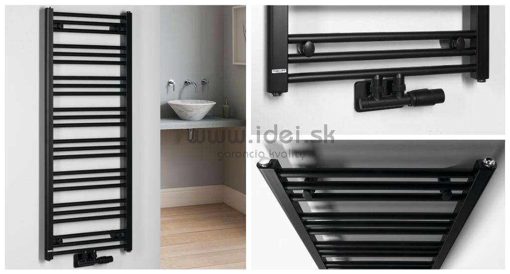 Rebríkový čierny kúpeľnový radiátor s možnosťou napojenia ústredného kúrenia aj elektrickej vykurovacej tyče.