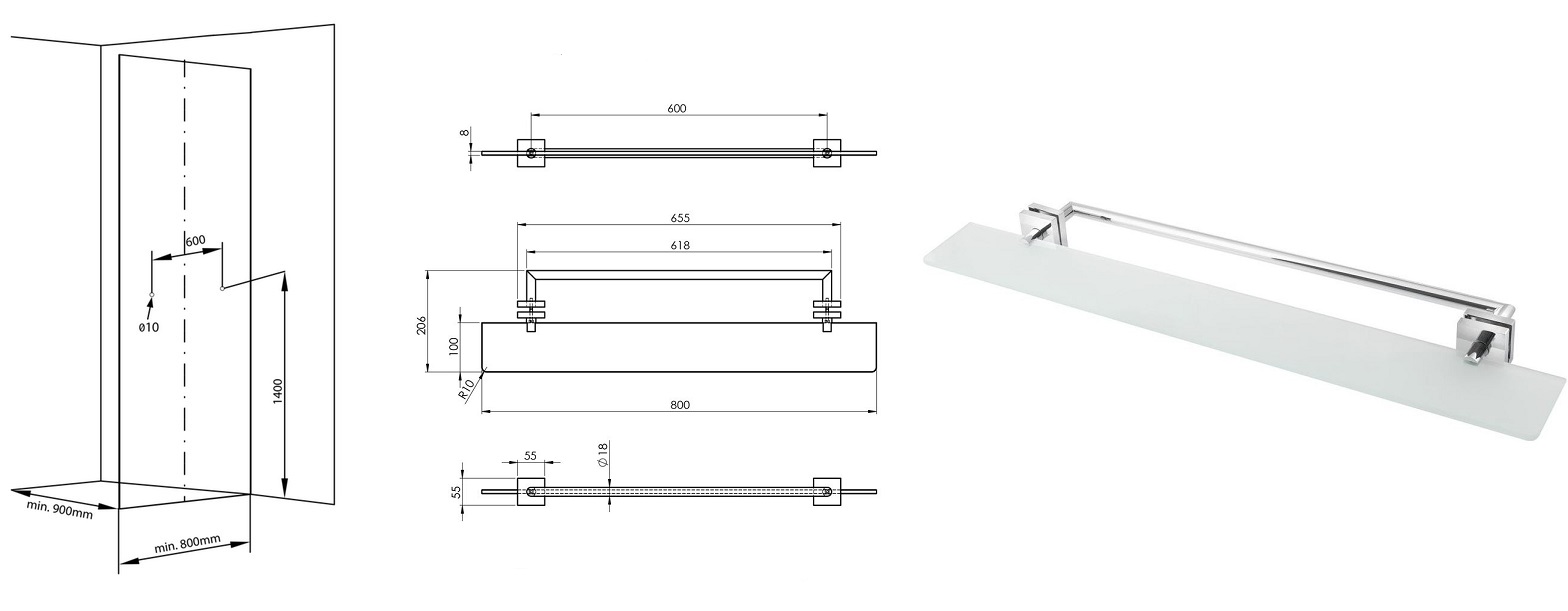 - ako voliteľné príslušenstvo Vám ponúkame policu na šampóny a držiak na osušky 2v1 (v tomto prípade Vám dodáme zasklenie s predvŕtanými otvormi na policu)