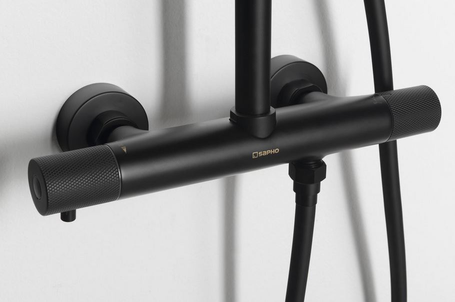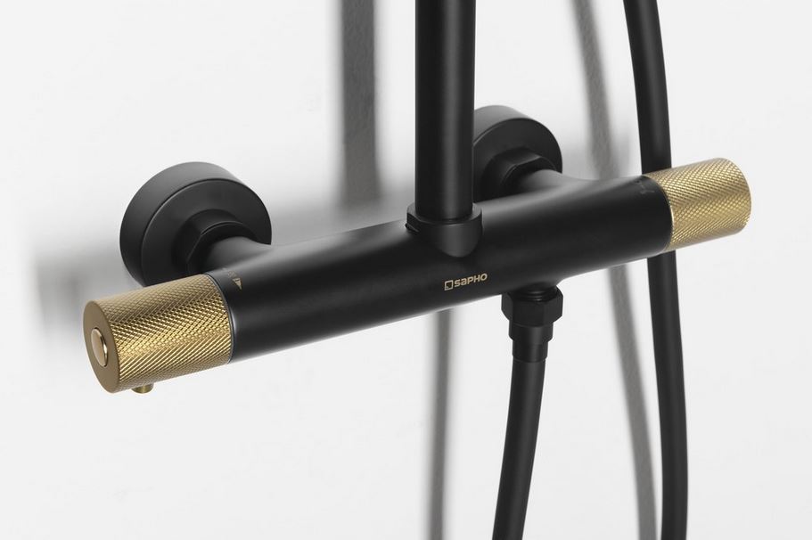 Táto sprchová termostatická batéria krásne dotvorí vzhľad vašej kúpeľne. Jej výhodou je že klasické čierne matné prevedenie, ktoré sa hodí do industriálnej kúpeľne môžete oživiť zlatým alebo medeným ovládaním. Viete si jednoducho zladiť vodovodnú batériu napríklad s úchytmi na kúpeľnovom nábytku.